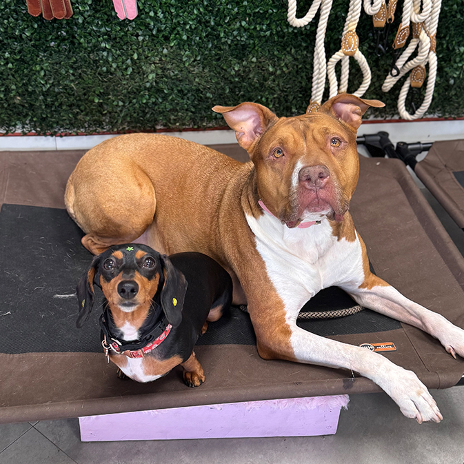 During the day, students are rotated through 4 10-15 minute focused training sessions throughout the day on obedience cues. As they advance through training, new cues will be taught at your pup's pace.